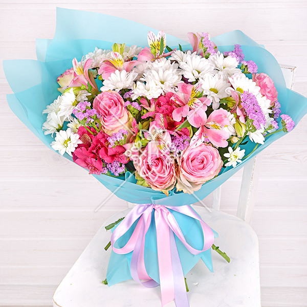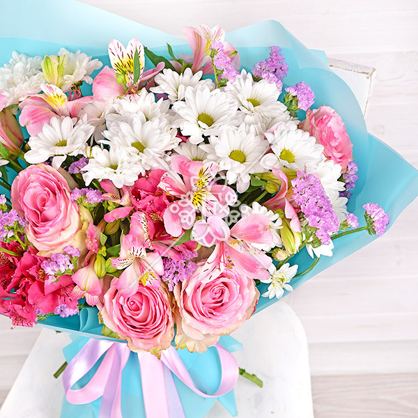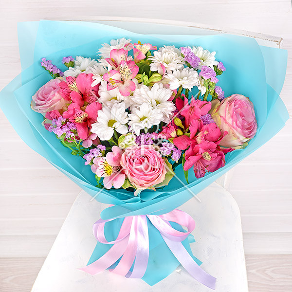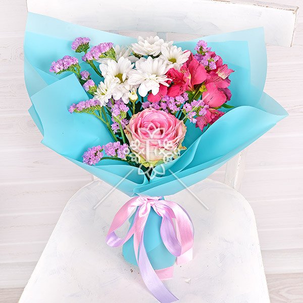 Роза розовая -1шт., альстромерия  розовая  -1 шт., хризантема кустовая белая – 1 шт., статица сиреневая -1 шт., упаковка, лента.